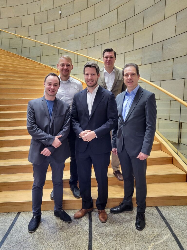 Nach dem Besuch tauschten sich Dennis Jahn (unten links) und sein Referent Mario Minkmar (oben links) mit Dr. Martin Vincentz, Vorsitzendem der AfD-Landtagsfraktion (unten Mitte), sowie mit dem parlamentarischen Geschäftsführer der Fraktion, Christian Loose (unten rechts), und dem Referenten für Rechtsfragen, Jan-Hendrik Schulz (oben rechts), aus.